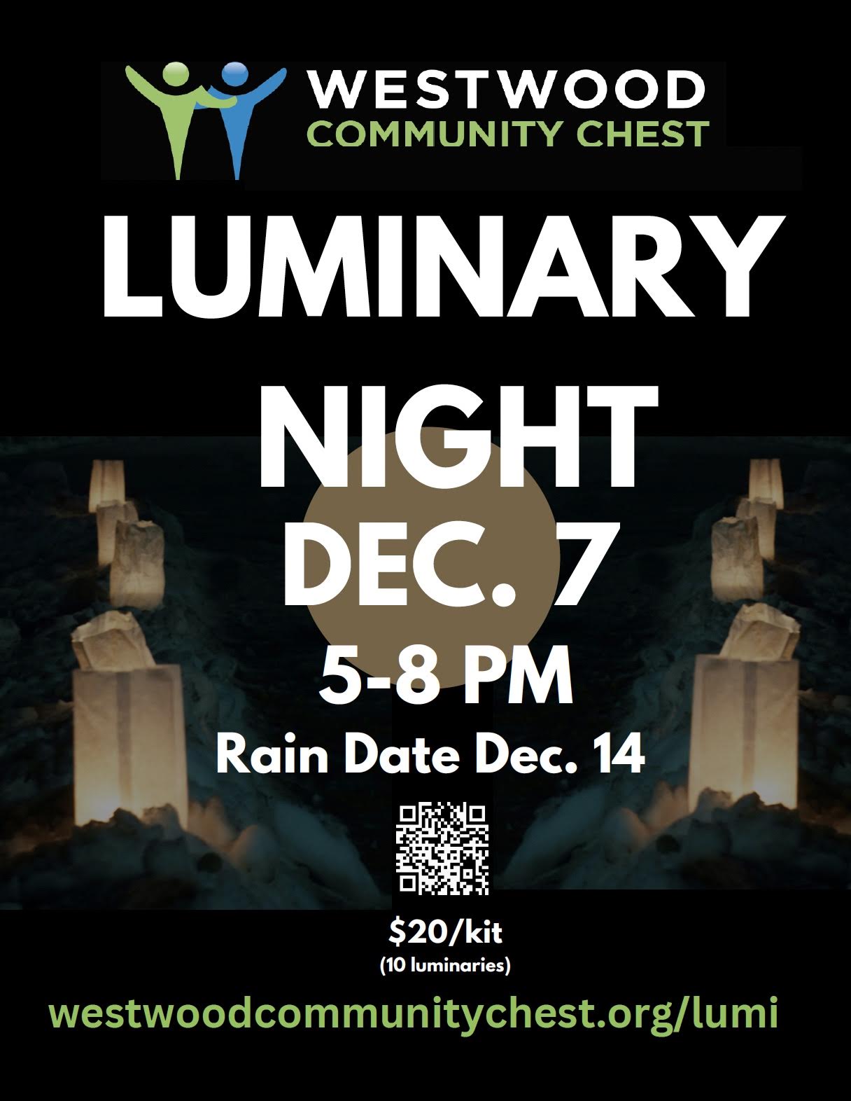 Thank you for participating in our second annual Luminary Night. For the past 16 years, WCC has been fortunate enough to be able to help fellow Westwood residents in their time of financial need. We also provide financial assistance to families for local summer camps through our Campership Awards. It is through your generosity and the generosity of our local businesses that allow WCC to help our neighbors in need.